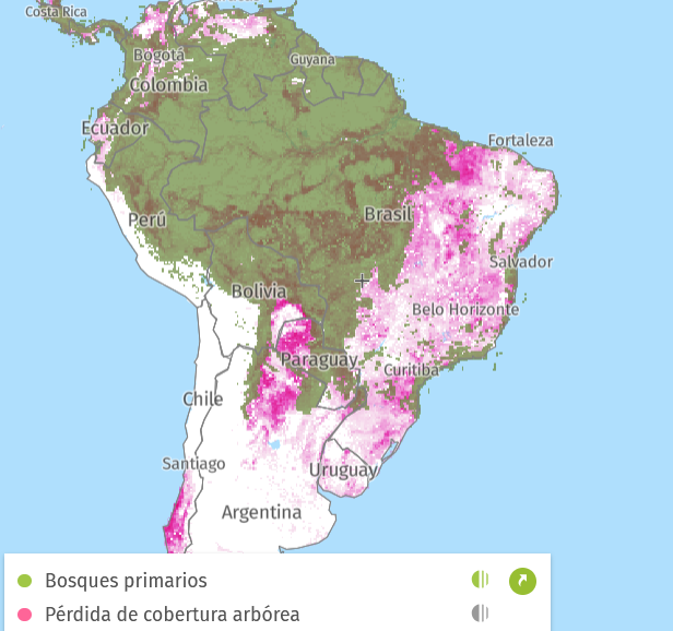 En verde bosques, en rosa, la pérdida de los mismos, la deforestación sigue y es un problema a atender. Imagen de https://www.globalforestwatch.org